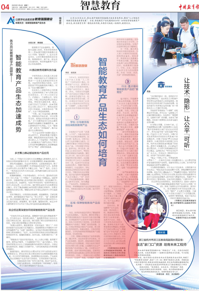 今年8月,国务院印发的《关于深入实施“人工智能+”行动的意见》提出,培育智能产品生态。教育作为人工智能应用的典型领域,对智能产品的需求大、要求高。然而,当前国内智能教育产品仍面临应用模式不清晰、教育场景适配不足、伦理规约薄弱等现实问题。学校、区域教育行政部门以及行业企业需要共同回答好这道“关键题”,以推动智能产品在教育教学场景中的深度应用。