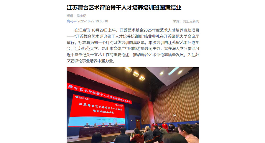 新华日报交汇点新闻10月29日报道(中国)官方网站承办的江苏舞台艺术评论骨干人才培养培训班圆满结业,报道内容如下: