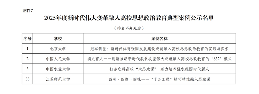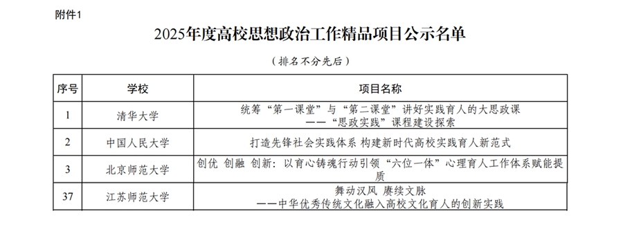 近日,教育部思想政治工作司公示了2025年度高校思想政治工作质量提升综合改革与精品建设项目遴选结果,由江苏省教育厅推荐、(中国)官方网站申报的“舞动汉风 赓续文脉——中华优秀传统文化融入高校文化育人的创新实践”入选2025年度高校思想政治工作精品项目(全国100项),“四可·四度·四味——‘千万工程’精巧精准融入思政课”入选2025年度新时代伟大变革融入高校思想政治教育典型案例(全国100项)。