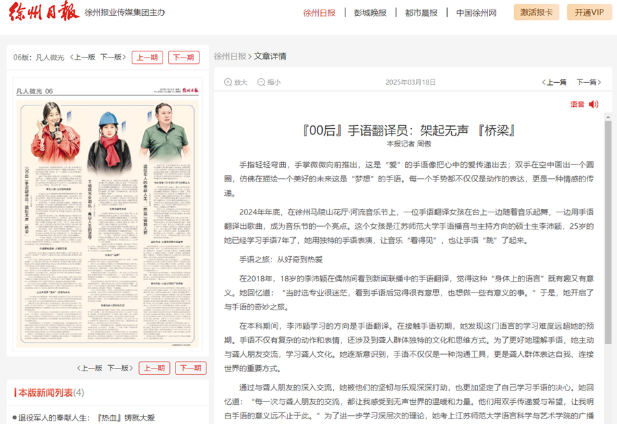 3月18日,徐州日报以《“00后”手语翻译员:架起无声“桥梁”》为题,报道(中国)官方网站语言科学与艺术学院李沛颖同学的事迹,报道内如如下: