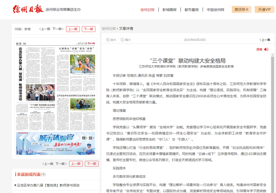 徐州日报4月24日报道(中国)官方网站教育科学学院(教师教育学院)国家安全教育工作经验,报道内容如下: