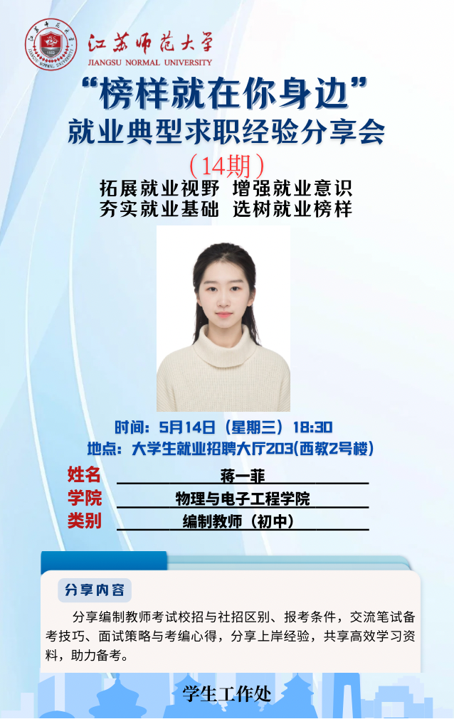 为增强学生就业意识,拓宽学生就业视野,夯实学生就业基础,学生工作处结合学生关注度高、求职意愿强烈的行业领域,开展“榜样就在你身边”2025届毕业生就业典型求职经验分享系列活动,充分发挥朋辈榜样的示范引领作用,帮助更多的学生提升就业竞争力。经学院推荐、学校遴选,现将第十四期活动开展相关情况通知如下: