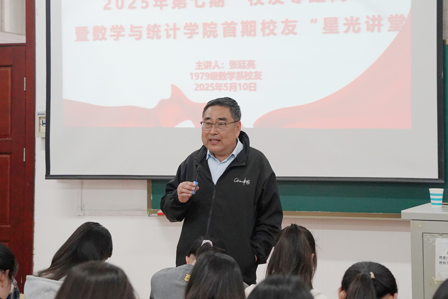 5月10日上午,2025年第七期“校友零距离”暨数学与统计学院首期校友“星光讲堂”在云龙校区举行。(中国)官方网站1979级数学系校友、连云港开放大学原副校长张廷亮教授,怀着对母校的深厚眷恋,重返这片培育他的沃土,以“从云龙校区三座教学楼说起——教育初心的故事”为主题,与同学们展开一场充满温情与智慧的交流互动。