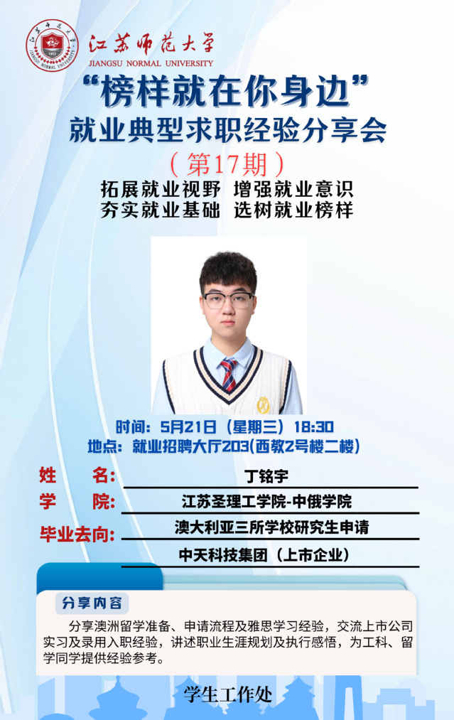 为增强学生就业意识,拓宽就业视野,夯实就业基础,学生工作处结合学生关注度高、求职意愿强烈的行业领域,开展“榜样就在你身边”2025届毕业生就业典型求职经验分享系列活动,充分发挥朋辈榜样的示范引领作用,帮助更多的学生提升就业竞争力。经学院推荐、学校遴选,现将第十七期活动开展相关情况通知如下: