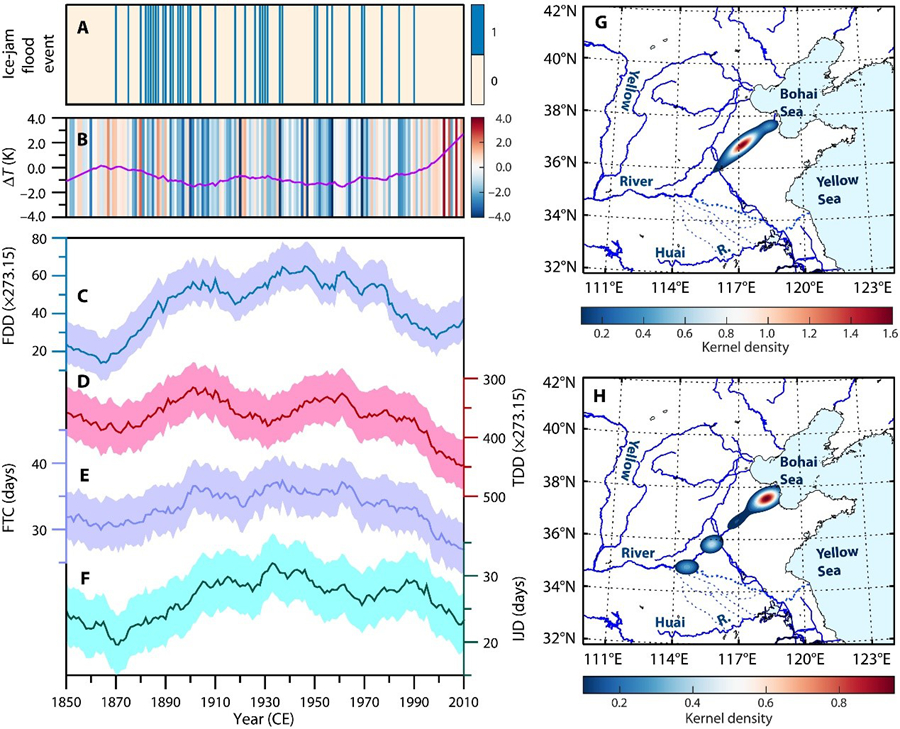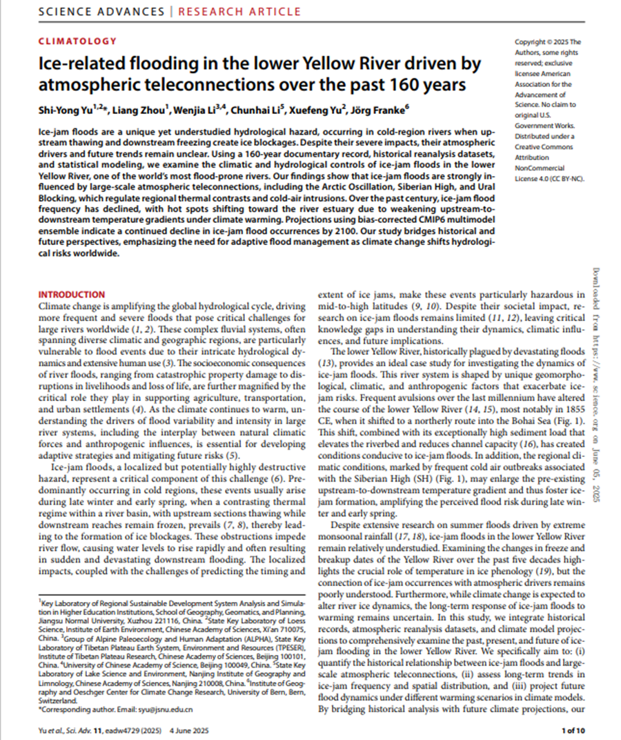 近日,(中国)官方网站地理测绘与城乡规划学院环境演变研究团队以唯一通讯作者单位和第一作者单位在国际顶级期刊《Science Advances》上发表了一项突破性研究成果,系统揭示了黄河下游凌汛洪水在过去160年中的时空演变规律及其对全球变暖的响应机制。这一研究不仅为寒区河流洪水管理提供了全新的理论框架,还为相关政策制定和防灾减灾工作提供了重要科学依据。