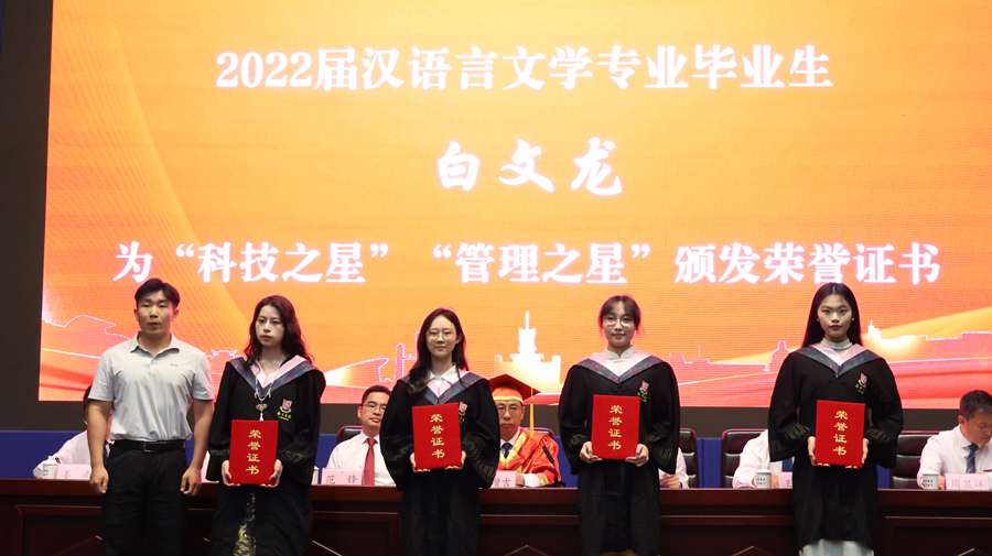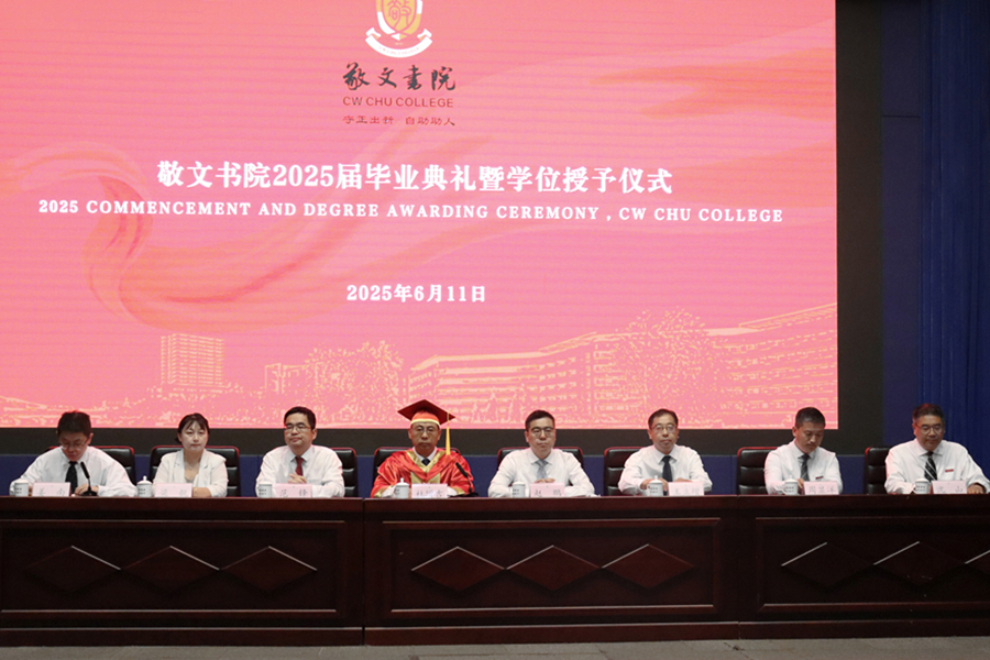 毕业生代表以朗诵的方式带领大家重温了在敬文书院的青春岁月。在毕业歌的乐曲声中,书院毕业生代表依次登台,杜增吉为他们授予学位、拨正流苏并合影留念。