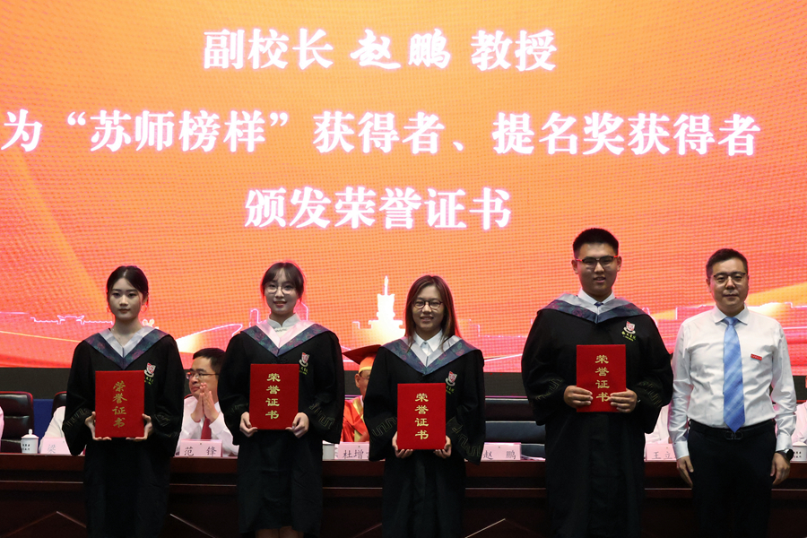 毕业生代表陶凯文,院友代表张雨欣,家长代表沈永兵,导师代表王兴启在毕业典礼上发言。典礼上,表彰了“四星毕业生”“荣誉毕业生”和“优秀毕业生”代表。赵鹏为“苏师榜样”获得者、提名奖获得者颁奖。