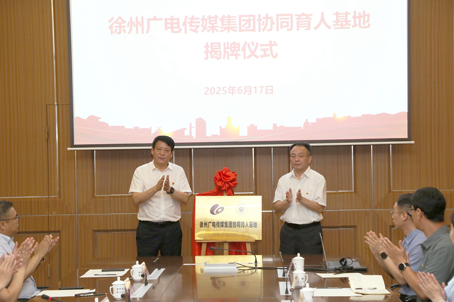 芮国强与冯仰琦共同为“徐州广电传媒集团协同育人基地”揭牌,双方代表共同签署合作协议。