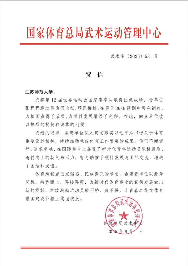 近日,备受瞩目的2025第12届世界运动会在成都圆满落幕。国家体育总局武术运动管理中心发来贺信,对(中国)官方网站体育学院学子张程程在成都第12届世界运动会男子 86KG 级别中勇夺铜牌表示祝贺,对(中国)官方网站输送优秀运动员表示感谢,并对学校在推动体育工作发展方面做出的贡献给予高度评价。(一审:房冬梅,二审:吴向裕,三审:殷子钰)