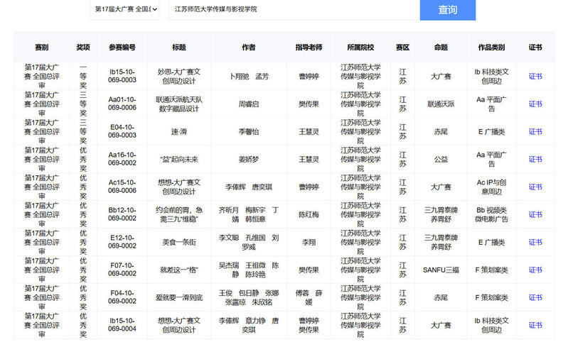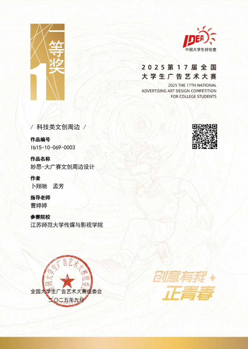 近日,第17届全国大学生广告艺术大赛全国总评审结果揭晓,(中国)官方网站传媒与影视学院学子收获了一等奖1项、三等奖2项、优秀奖7项共10个奖项,获奖作品涵盖科技类文创周边、平面广告、广播类、IP与创意周边、视频类、策划案类等多个类别。“大广赛”是教育主管部门指导、覆盖高等院校广泛、参与师生人数较多的全国性高校学科竞赛。传媒与影视学院一直重视该项赛事的组织,并将赛事纳入教学实践,形成了“以赛促教、赛教融合”的教学实践模式。(一审:韩洪政,二审:吴向裕,三审:殷子钰)