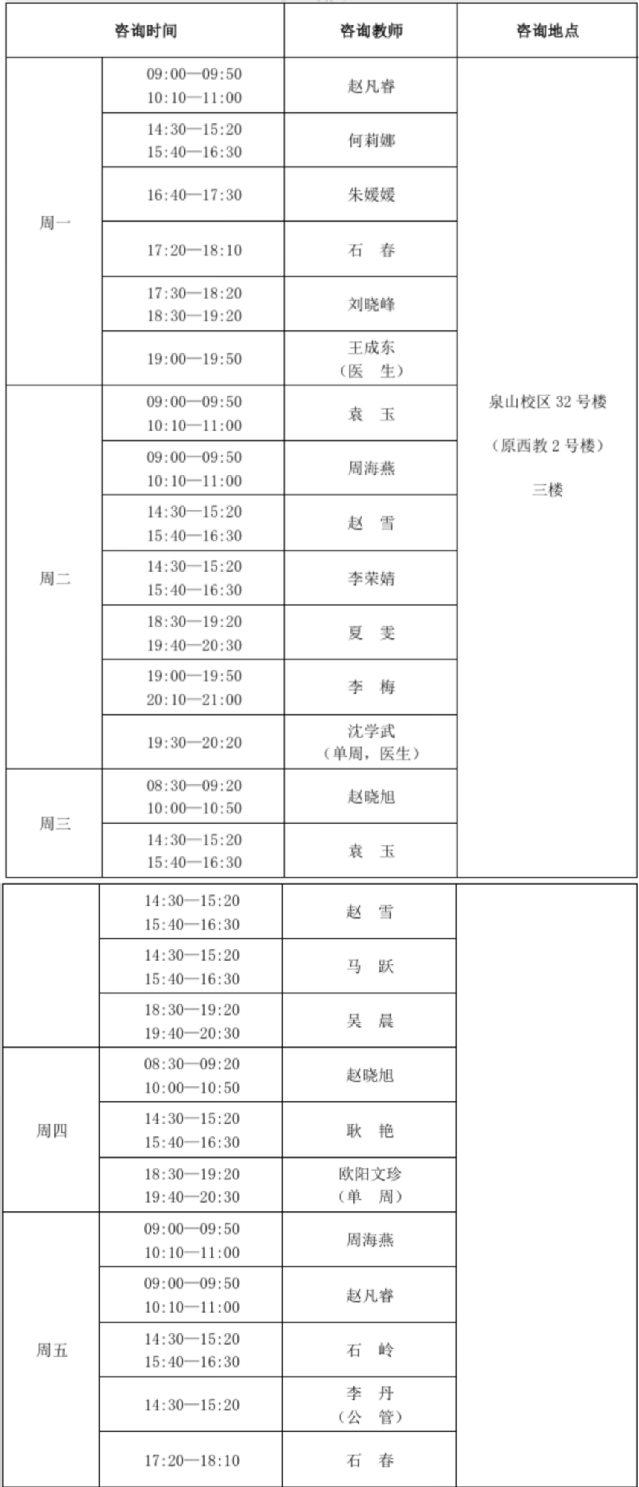 2.[第2周起]面对面心理咨询与功能室预约时间:周一至周五8:00—12:00、14:00—17:00、18:00—20:00;