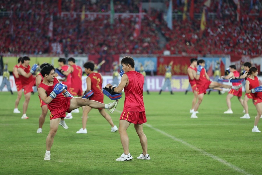9月20日晚,“苏超”联赛第12轮徐州队与苏州队的比赛在徐州奥体中心拉开帷幕。开赛前夕,169名安博·体育学子以一场气势恢宏的《大汉雄风》表演,将现场氛围推向首个高潮。这场长达7分钟的表演,将中华武术与兵马俑舞元素深度融合,以“武魂起,俑魄生”为核心理念,通过刚猛凌厉的武技与雄浑厚重的舞姿,生动再现了古代战场的豪情。刀光随鼓点流转,阵型随韵律变幻,动静之间,令现场数万名观众沉浸于跨越时空的文化震撼,更彰显出徐州作为两汉文化发源地的深厚底蕴。