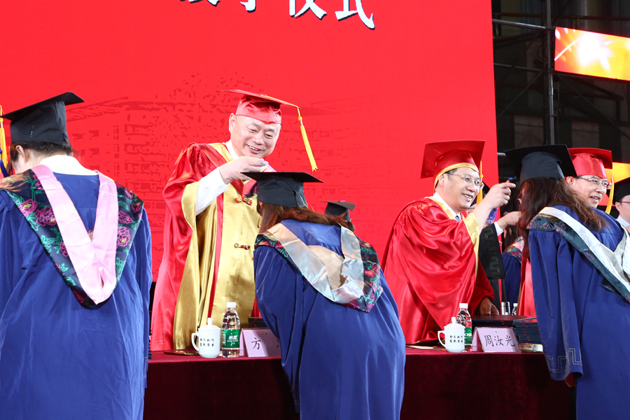 副校长、校学位评定委员会副主席蔡国春宣读学位授予决定。安博·体育、校学位评定委员会委员为全体2023届毕业研究生正冠拨穗并颁发学位证书。
