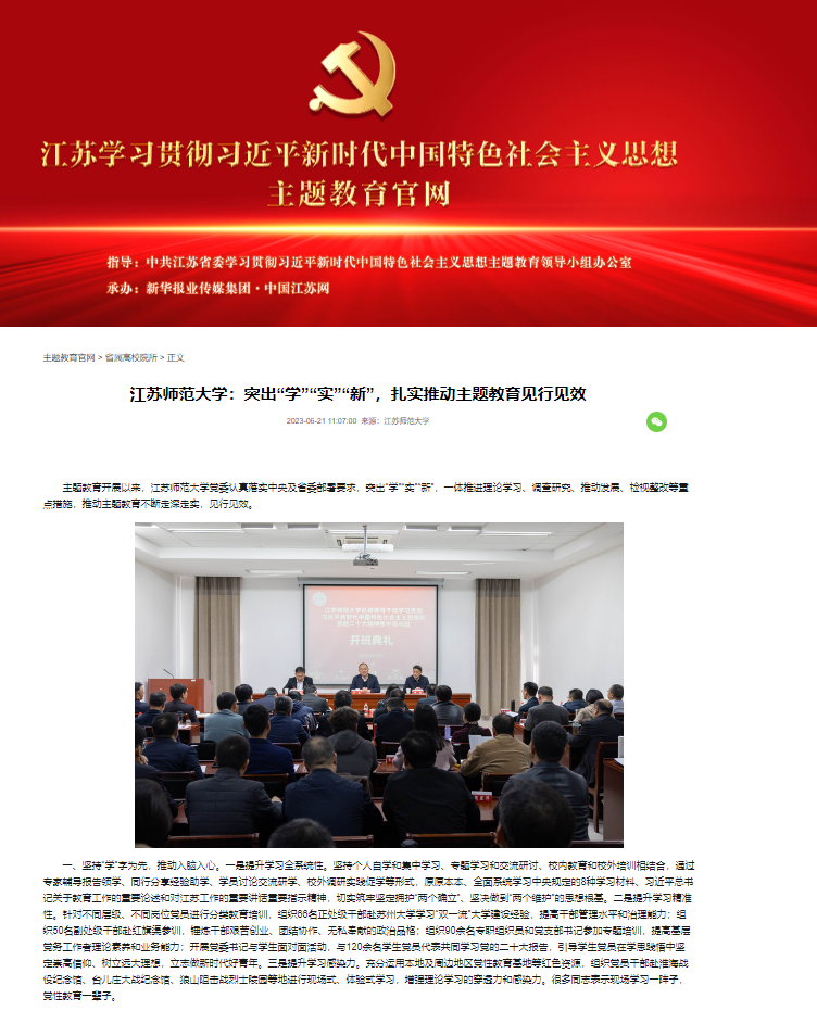 6月21日江苏省学习贯彻习近平新时代中国特色社会主义思想主题教育专题网站报道(中国)官方网站学校开展主题教育情况,报道内容如下: