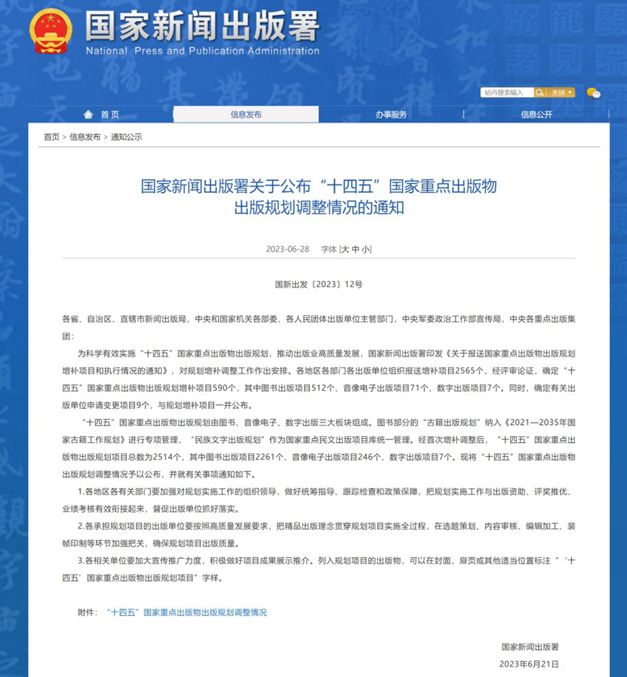 “十四五”国家重点出版物出版规划是我国出版业最高级别的出版专项规划,旨在进一步提升国家精品出版能力,推动出版业高质量发展,助力科技强国和文化强国建设。“十四五”国家重点出版物出版规划图书项目分为哲学社会科学、文学艺术、自然科学与工程技术、未成年人出版物、民族文字、古籍等子规划项目,其中,哲学社会科学出版规划此次共1000余项参与评选,最终200项入选。
