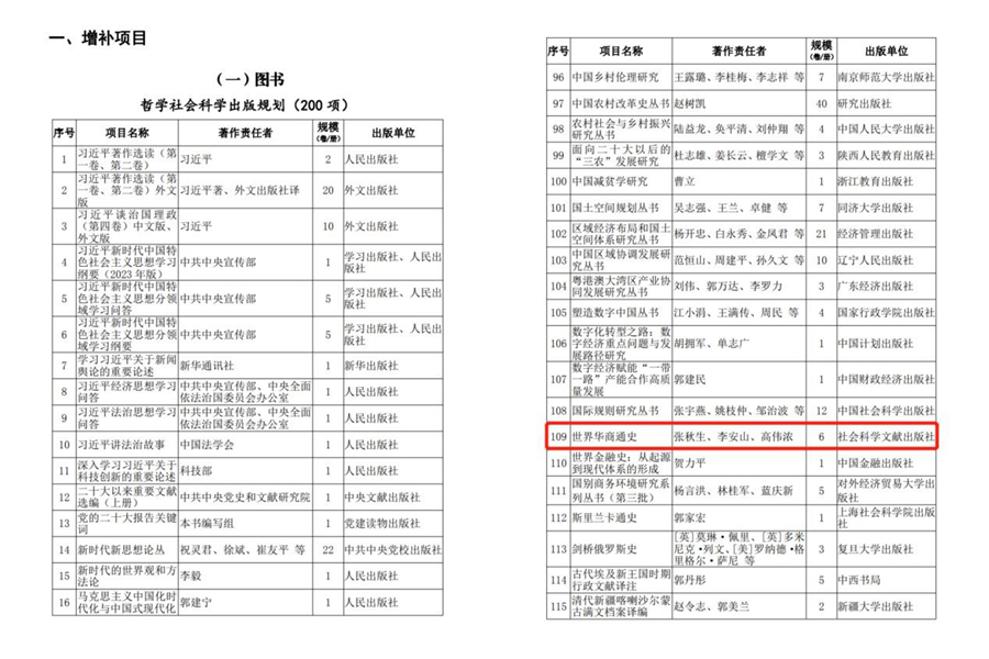 近日,国家新闻出版署印发了《关于公布“十四五”国家重点出版物出版规划调整情况的通知》(国新出发【2023】12号),(中国)官方网站华侨华人研究/澳大利亚研究中心主任、历史文化与旅游学院张秋生教授主持的国家社科基金重大项目《世界华商通史》被增补为国家“十四五”重点出版项目。