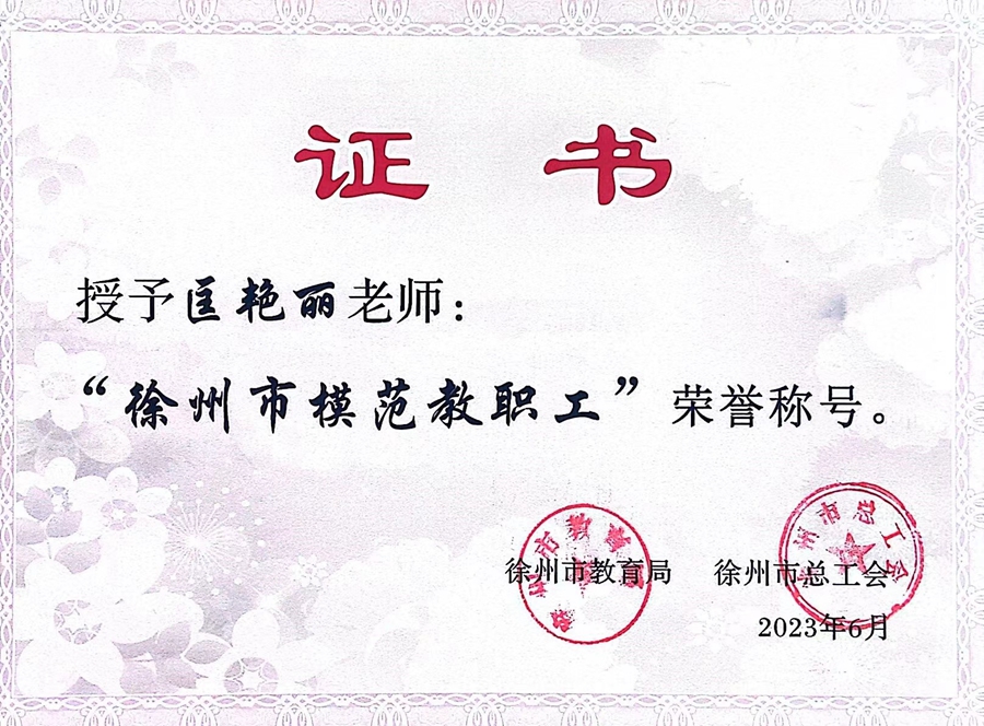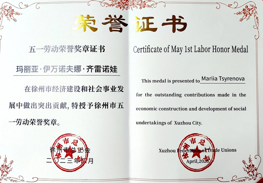 为大力弘扬劳模精神、劳动精神、工匠精神,深入贯彻落实习近平总书记关于教育的重要论述,引领全市职工奋发进取、拼搏奉献,为中国式现代化徐州新实践再创佳绩,经全市各单位逐级民主推选、综合评议和公示,近日,徐州市总工会、徐州市教育局、徐州市妇女联合会等单位,先后表彰了一批先进集体和个人(徐工发〔2023〕16号、徐教〔2023〕19号)、徐教师〔2023〕2号)。(中国)官方网站中俄学院俄罗斯籍教师MARIIA TSYRENOVA(玛丽亚·伊万诺夫娜·齐雷诺娃)荣获2023年“徐州市五一劳动荣誉奖章”;马克思主义学院匡艳丽老师荣获2023年“徐州市模范教职工”称号;文学院张爱玲老师荣获2023年度“徐州市优秀女教师”称号。