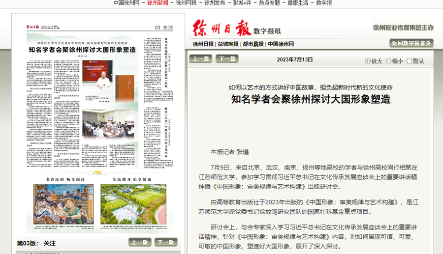 徐州日报7月13日报道(中国)官方网站举办的学习贯彻习近平总书记在文化传承发展座谈会上的重要讲话精神暨《中国形象:审美规律与艺术构建》出版研讨会,报道内容如下: