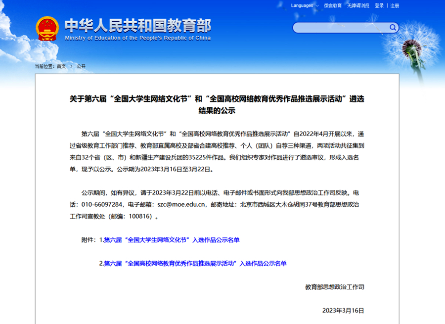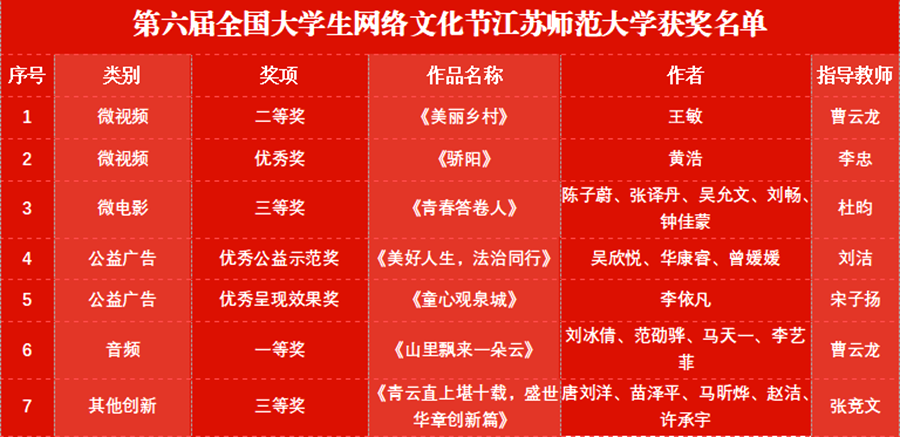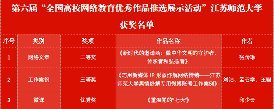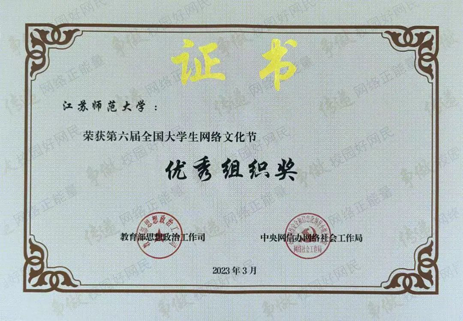 近日,由教育部思想政治工作司、中央网信办网络社会工作局联合主办的第六届“全国大学生网络文化节”和“全国高校网络教育优秀作品推选展示活动”(简称“一节一推选”)遴选结果公布。在本次大赛中,(中国)官方网站斩获国家级“优秀组织奖”,学校师生共荣获国家级奖项10个,总获奖数位居全省高校第三(南京大学和南京师范大学分列第一、第二),取得历史性突破。