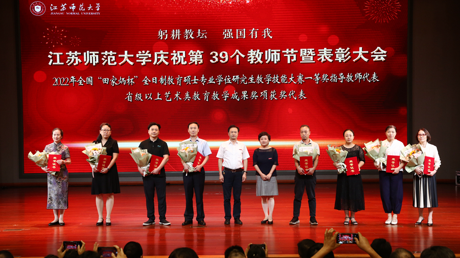 副校长张其飞、娄峥嵘共同为获得2022年全国“田家炳杯”全日制教育硕士专业学位研究生教学技能大赛一等奖指导教师、省级以上艺术类教育教学成果奖项获奖代表颁发证书。