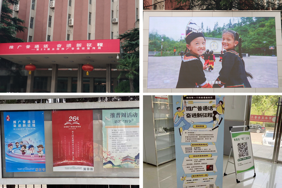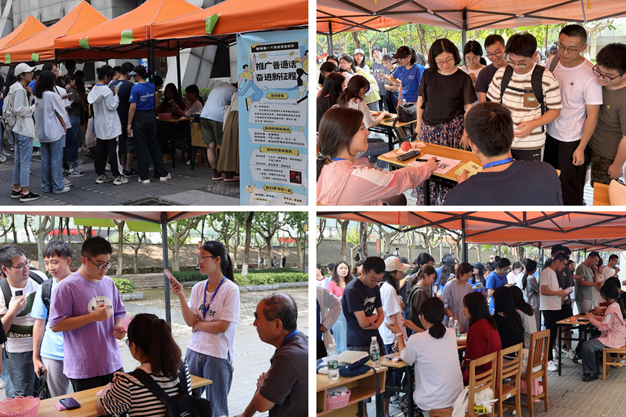 推普周期间,校语委通过在钟楼悬挂推普主题宣传横幅,在阅报栏和各学院张贴宣传海报,在电子屏滚动播放推普宣传海报和推普公益广告等线上线下相结合的方式,营造了浓厚的宣传氛围。9月9日至10日,恰逢2023级新生报到,校语委将语艺社精心设计的推普周活动宣传“易拉宝”,摆放在校园巴士候车点及学生餐厅等地,让“推普”与新生“不期而遇”、“美丽邂逅”。一种关于语言、关于文字的情绪和悸动,悄然氤氲校园。