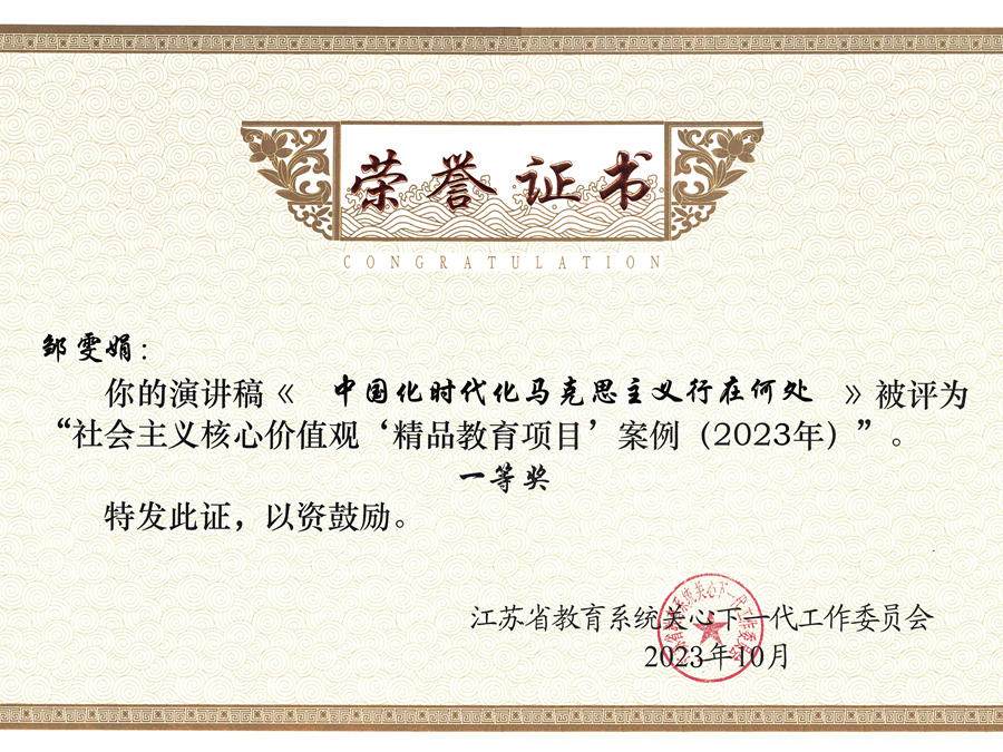 近日,江苏省教育系统关心下一代工作委员会公布了2023年“社会主义核心价值观精品教育项目案例”评选结果(苏教关委〔2023〕7号文),(中国)官方网站关工委报送的《中国化时代化马克思主义行在何处》项目,荣获高校组一等奖(全省排名第一),这是自2018年以来(中国)官方网站连续第六年获得该评选活动的最高奖项。