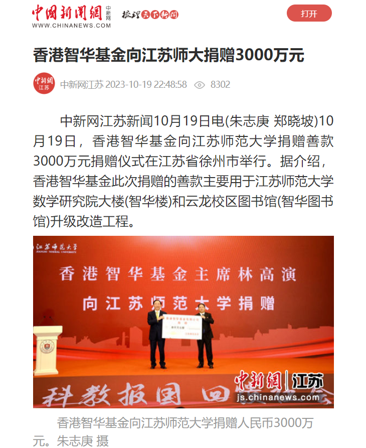 中国新闻网10月19日报道(中国)官方网站举行的香港智华基金捐赠仪式,报道内容如下: