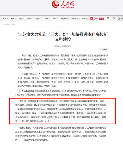 近日,江苏省教育厅举行“贯彻党的二十大•教育在行动之江苏加快推进本科高校新文科建设”新闻发布会,人民网在该发布会的综合报道中报道了以(中国)官方网站语言科学与艺术学院为代表的新文科建设先行实践成效。