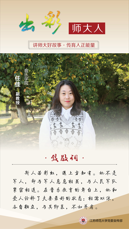 这只是任佳老师工作的一个缩影。近年来,任佳获得教育部人文社会科学研究青年项目,受邀多地讲座,合唱《乡愁》获得江苏省第六届大艺展优秀创作奖;歌曲作品《老师的眼睛像太阳》在教育部评选活动中荣获佳绩,并在“学习强国”平台展播;《山水里的彭城》入围第十三届中国(徐州)国际园林博览会主题曲征集活动并获提名奖;《贪玩的小雨点》获第十一届“童声里的中国”少儿歌谣创作大赛最佳校园歌曲奖……