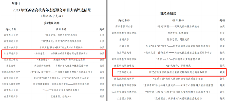 《“法治惠农”——法律援助赋能乡村电商志愿服务项目》由法学院知识产权志愿者工作站组织实施,志愿者们通过调查问卷、焦点座谈、实地走访,调研乡村电商经营者在经营中存在的诸多知识产权问题,开展了版权登记、知识产权体检、知识产权普法宣传、专项培训、撰写知识产权意见书等五个维度的知识产权志愿专项服务工作,项目先后被《中国知识产权报》等数家媒体报道,产生了良好的社会效应。《“园艺疗法”聚焦孤独症儿童社交障碍问题志愿服务项目》由生命科学学院红烛志愿者服务队组织实施,与江苏省9市10家孤独症儿童康复中心建立志愿服务基地,并单独编班开展“园艺疗法”志愿服务。志愿者们通过构建“园艺疗法”课堂双线辅助体系,设计课堂指导手册,努力提高低龄孤独症儿童的社交能力,为孤独症儿童创造了与植物相伴的温情世界。