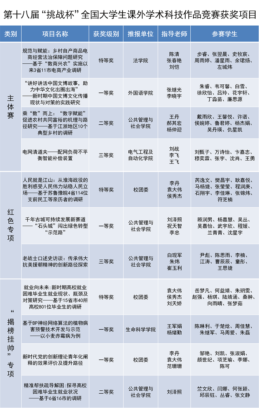 在主体赛中,《规范与赋能:乡村自产商品电商经营法治保障问题研究——基于“数商兴农”实施以来3省11市电商产业调研》荣获特等奖,《“讲好讲活中国文博故事,助力中华文化出圈出海”——新时期中国文博文化传播现状与对策的实践研究》荣获一等奖,《乘“数”而上:“数字赋能”促进农村共同富裕的机理与路径研究——基于江浙地区10个典型乡村的调研》荣获二等奖,《电网清道夫——配网负荷不平衡智能补偿装置》荣获三等奖;红色专项赛中,《人民就是江山:从淮海战役的胜利感受人民伟力站稳人民立场——基于苏鲁豫皖4省114位支前民工等亲历者的调研》荣获特等奖,《千年古城可持续发展新赛道——“石头城”闯出绿色转型“示范路”》荣获一等奖,《老战士口述史访谈:传承伟大抗美援朝精神的创新路径探索》荣获三等奖;“揭榜挂帅”专项赛中,《就业向未来:新时期高校就业困难毕业生就业现状、瓶颈及对策研究——基于15省市40所高校801位毕业生的调研》荣获特等奖,《新时代党的创新理论青年化阐释的效果评价及提升路径》荣获一等奖,《基于BP神经网络算法的植物病害预警技术开发与示范——以小麦赤霉病为例》荣获一等奖,《精准帮扶疏导解困:探寻高校困难毕业生就业状况——基于6省16市的调研》荣获二等奖。