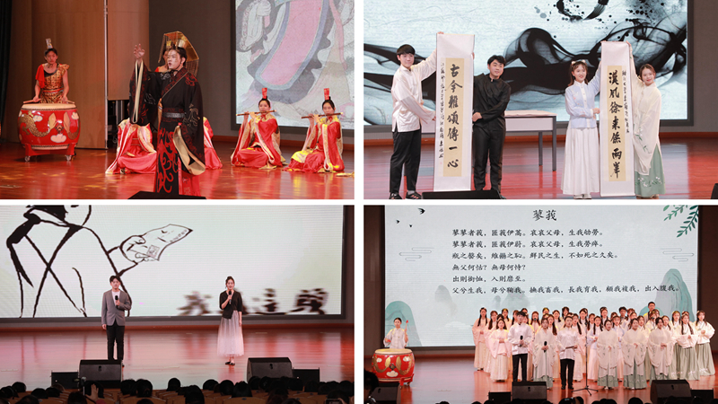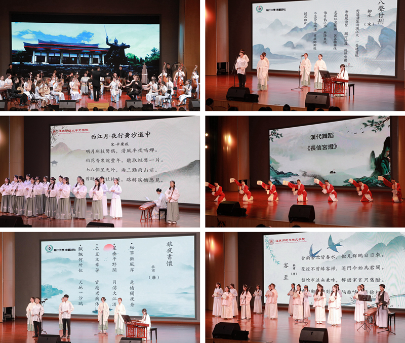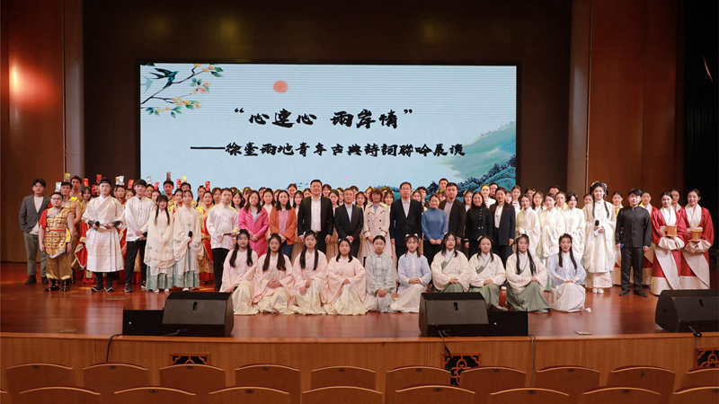 4日晚,“心连心 两岸情”——徐台两地青年古典诗词联吟展演在马可音乐厅举行。演出节目分为“山河有情,日月共辉”“我有嘉宾,情牵汉唐”“君有归期,同饮一觞”三个板块。随着民族乐团《一城山色半城湖》宛转悠扬乐声的响起,演出正式拉开序幕。来自辅仁大学东篱诗社学生的诗词吟诵《八声甘州·对潇潇暮雨洒江天》,让在场的师生感受到了诗词的婉转绵长;文学院悠然诗社的诗词吟诵《关山月》,铿锵有力,气势雄浑;奔放豪迈的吟诵《大风歌》将演出推向了高潮。文学院悠然诗社的学生现场泼墨挥毫,向辅仁大学东篱诗社赠送内容为“汉风徐来系两岸,古今雅颂传一心”的书法作品,祝福两地青年携手共进,建立更加深厚的友谊,将中华优秀传统文化发扬光大。整场演出在两校诗社联袂吟诵的《蓼莪》中落下帷幕。