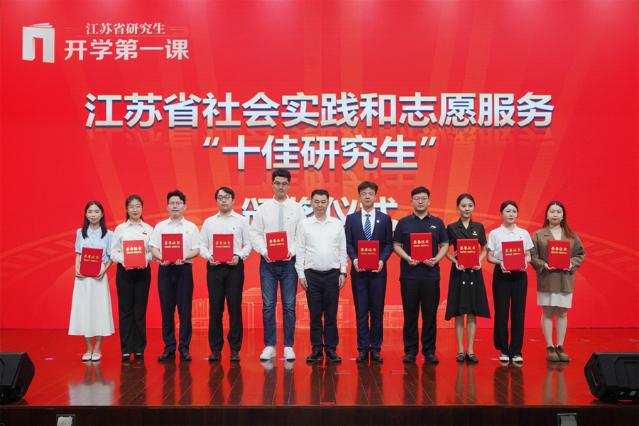 ▲第二届江苏省社会实践和志愿服务十佳研究生颁奖典礼现场(左起五为郝晟)