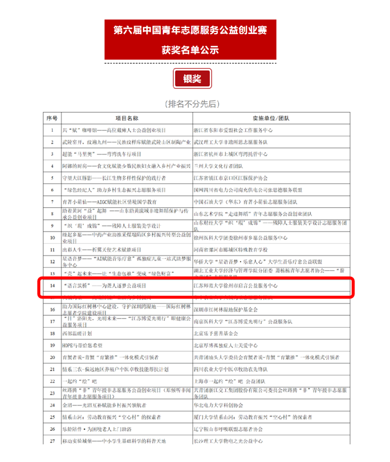 11月15日至16日,由共青团中央、中央社会工作部、民政部、水利部、文化和旅游部、国家卫生健康委、中国残联和中共广东省委、广东省人民政府联合主办的第六届中国青年志愿服务公益创业赛国赛终评在汕头举办。全国共有36个省级赛会单位累计1200余个公益创业项目参赛,271个项目进入国赛初评,100个项目入围终评,最终产生10项金奖、40项银奖和50项铜奖。江苏省共有6个高校项目入围全国终评,共获4项银奖和2项铜奖。(中国)官方网站语言科学与艺术学院刘俊飞、胡彦超、李倩南、刘承承老师指导的《“语言筑桥”——为聋人逐梦公益创业项目》荣获银奖。