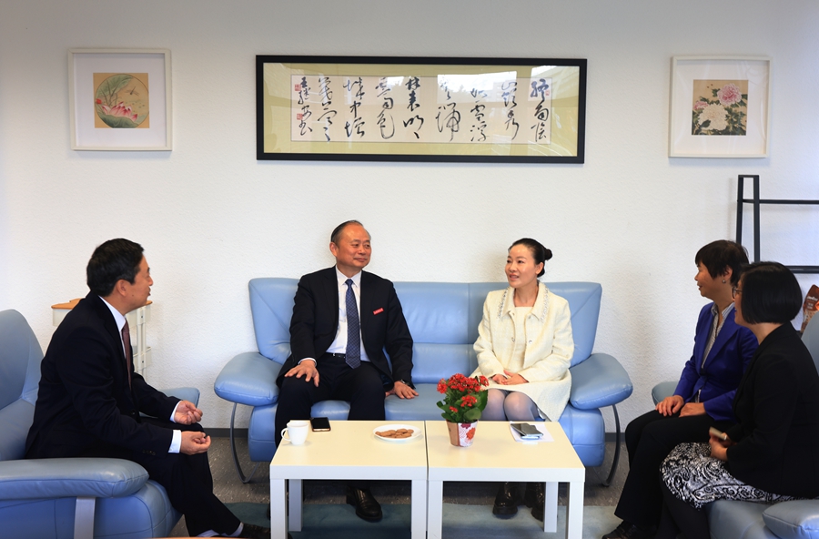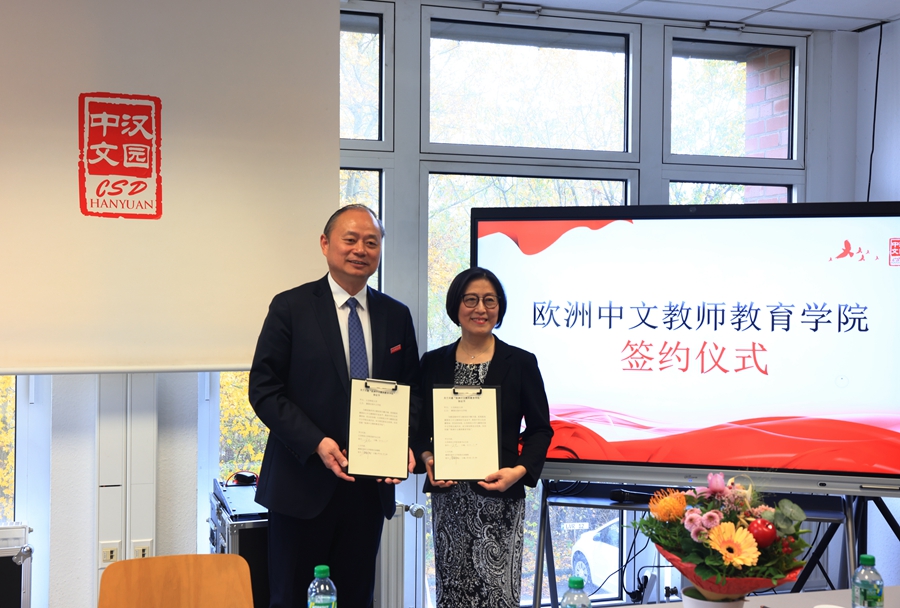 结束英国访问后,访问团一行乘机来到德国杜塞尔多夫,首先访问德国汉园中文学校(莱茵校区),与(中国)官方网站杰出校友、汉园中文学校董事长王杰和校长孙晓帆洽谈合作,中国驻杜塞尔多夫总领馆领侨部主任彭雯、全德中文学校联合总会副会长陈薇应邀出席活动。为推进海外华文教育的不断升级,系统提高德国本土中文教师的专业水平,安博·体育与德国汉园中文学校决定在杜塞尔多夫设立“欧洲中文教师教育学院”,并现场签约。