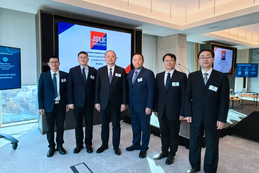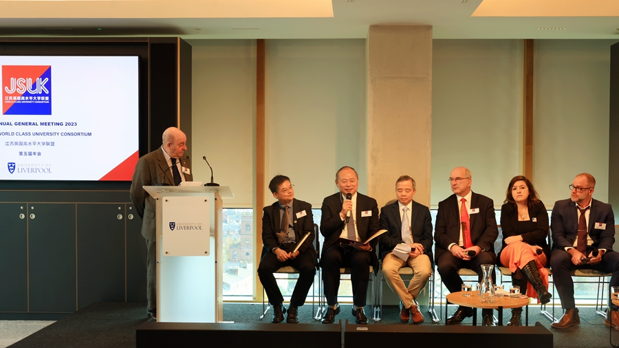 结束兰卡斯特的访问后,代表团一行来到英国利物浦大学并参加2023年江苏-英国高水平大学联盟年会暨第五届国际产学研合作论坛。16日,访问团听取了第五届国际产学研合作论坛部分专家报告。17日,访问团参加2023年江苏-英国高水平大学联盟年会的全部议程,首先听取了江苏和英国双方联盟所作联盟工作报告,随后,中国驻曼彻斯特总领事唐锐先生、英国文化教育协会华东区主任兼文化教育领事卡特•辛克莱•琼斯、利物浦市议会议员尼克•思默、江苏省教育厅一级巡视员徐子敏、利物浦大学常务副校长魏比•泛德•霍克为大会分别致辞。