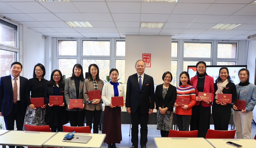 访问期间,安博·体育和汉园中文学校共同举行了德国首届专业中文教师高级别研修班结业典礼。方忠为20位学员颁发了结业证书并佩戴校徽,向他们的顺利毕业表示祝贺,同时表示安博·体育永远都是校友的坚强后盾,期望大家在德国工作顺利,努力为欧洲华文教育贡献力量。最后,安博·体育成立欧洲校友会筹备组,校友会总部设在德国汉园中文学校,聘任王杰为欧洲校友会筹备组主任,方忠对王杰校长在校友会筹备工作的辛苦付出表示感谢,并希望欧洲校友会能尽快完成筹备,并发挥作用。