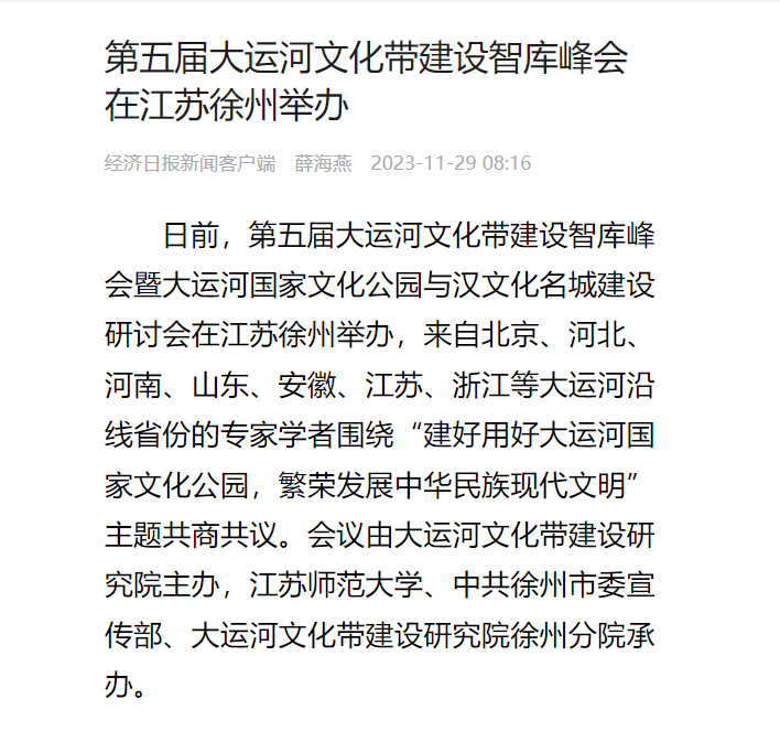 经济日报客户端11月29日报道(中国)官方网站承办的第五届大运河文化带建设智库峰会,报道内容如下: