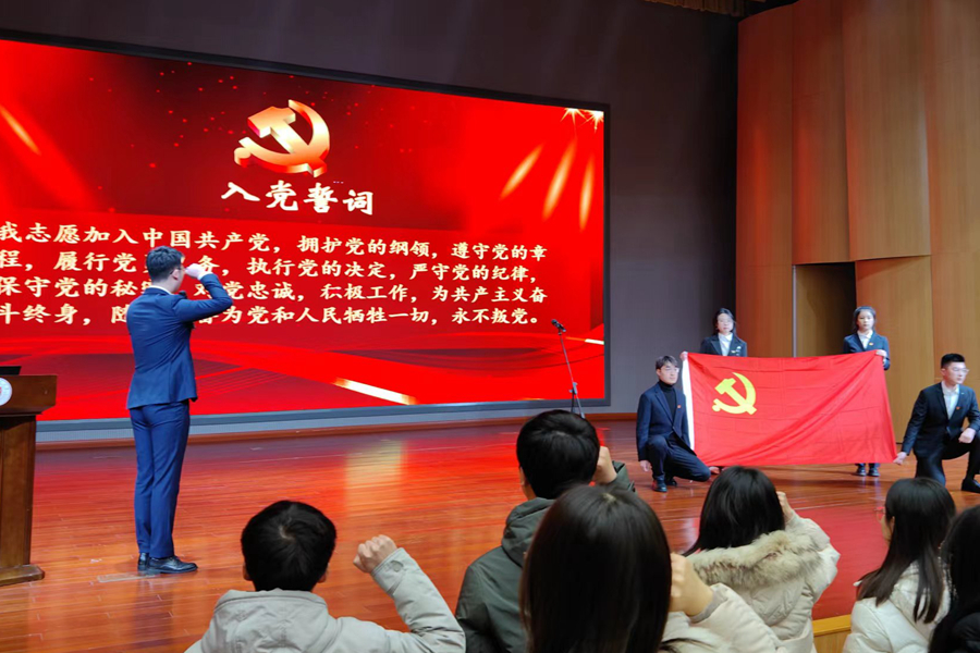 仪式开始,会场全体起立,奏唱中华人民共和国国歌,重温入党誓词。