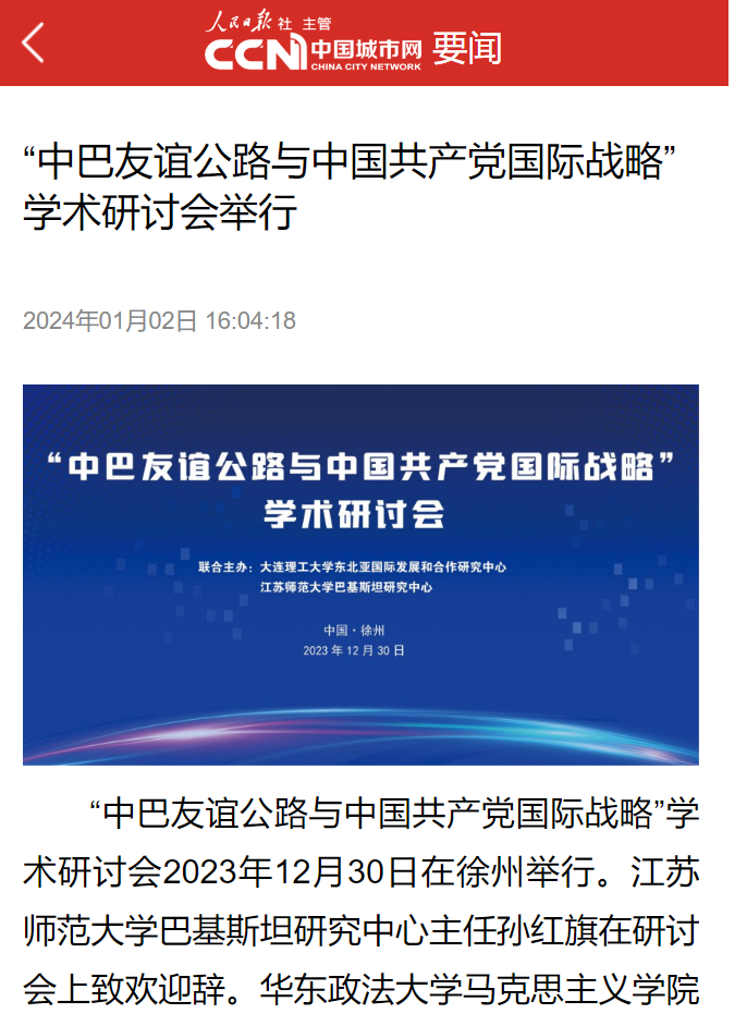中国城市网2024年1月2日报道在(中国)官方网站举办的“中巴友谊公路与中国共产党国际战略”学术研讨会,报道内容如下:
