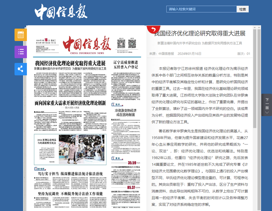 我国的经济优化理论起源于华罗庚先生。他对于这个理论的根本性贡献在于,从数学上给出了可计算的、唯一的经济平衡解,失去平衡时间的估计以及各种调整方案,可惜这一理论尚不完善,也没有高效算法的支撑。