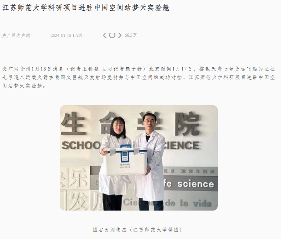 1月19日央广网报道(中国)官方网站刘伟杰教授团队研究成果入驻空间站,报道内容如下: