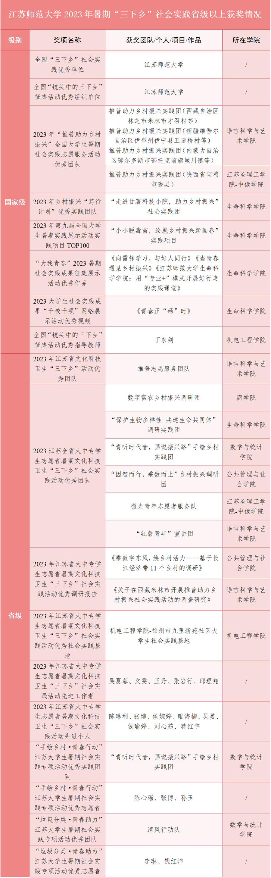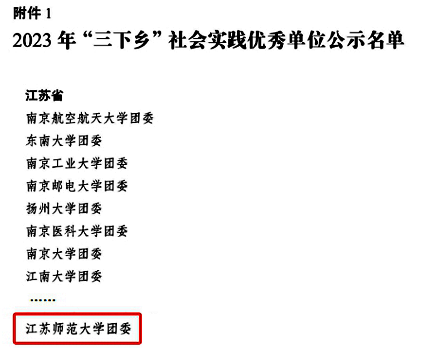 在省级表彰中,语言科学与艺术学院推普志愿服务团队获评2023年江苏省文化科技卫生“三下乡”活动优秀团队。商学院数字富农乡村振兴调研团等6支团队获评江苏省暑期文化科技卫生“三下乡”社会实践活动优秀团队,公共管理与社会学院、语言科学与艺术学院2篇调研报告获评优秀调研报告,机电工程学院社会实践基地获评优秀社会实践基地,吴夏蓉等5位老师获评先进工作者,陈琳利等8位同学获评先进个人。“手绘乡村·青春行动”“垃圾分类·青春助力”专项实践活动中,数学与统计学院2支实践团队获评省优秀团队,李琳等5位同学获评优秀志愿者。