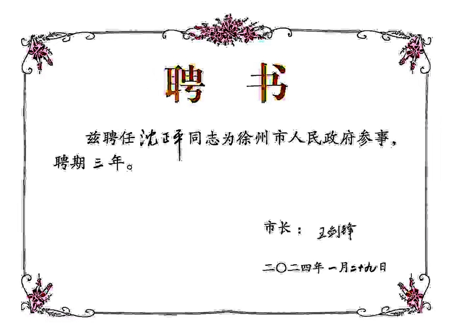2月27日下午,徐州市政府参事聘任仪式在新城区行政中心举办,徐州市市长王剑锋向15位受聘市政府参事颁发聘书并讲话。(中国)官方网站“一带一路”研究院执行院长沈正平教授受聘徐州市政府参事,这是他第三次获聘。