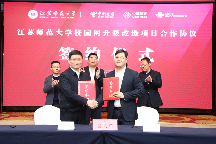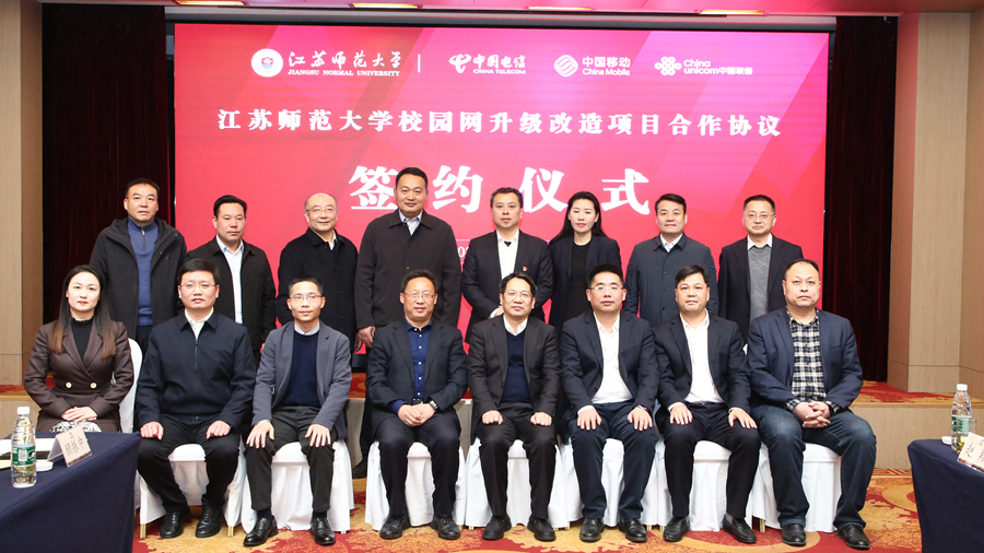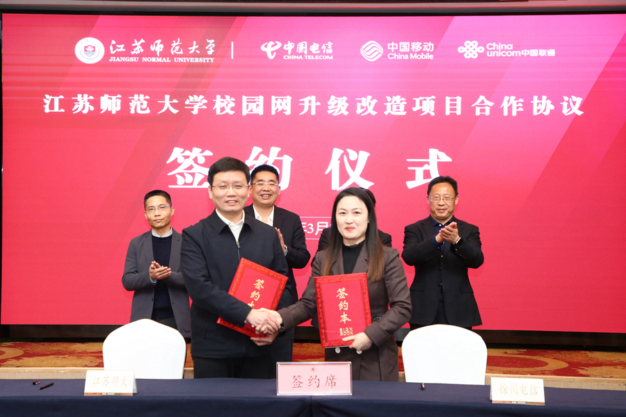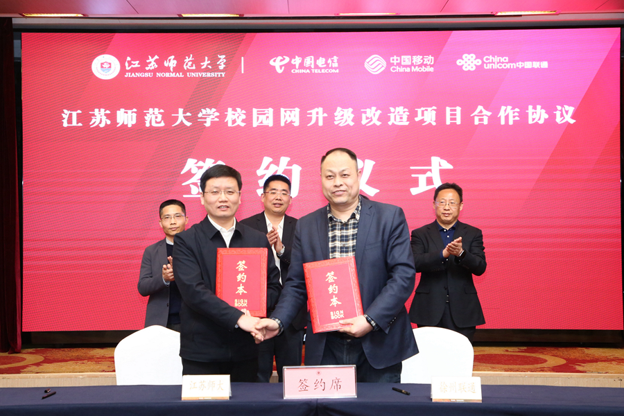 3月21日下午,(中国)官方网站与徐州电信、移动、联通三家运营商举行校园网升级改造合作协议签约仪式,校长周汝光、副校长商亮,中国电信徐州分公司总经理燕宪宏、副总经理刘伟伟,中国移动徐州分公司总经理徐星宇、副总经理赵翔,中国联通江苏分公司政企BG副总裁黄伟明、徐州分公司副总经理马桂军,校长办公室、后勤管理处、信息化建设与管理处、教育发展基金会办公室有关负责同志,以及三家运营商代表等参加了仪式。