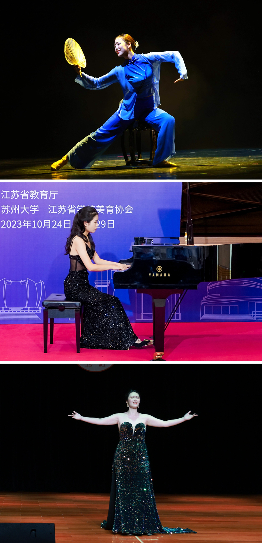 长期以来,学校高度重视美育工作,坚持美育在人才培养中的重要地位。本届展演活动自启动以来,(中国)官方网站党政领导高度重视,校团委(艺术教育中心)认真筹备,着力加强与相关部门、学院的协同配合,结合师范特色,举办(中国)官方网站师范生技能展演,创新开展首届青年才艺大赛暨江苏省第七届大学生艺术展演活动校内选拔赛,通过作品展示、评委评审、专家推荐等环节,推报优秀作品参加省赛。各参赛学院精心组织,全情投入,为作品创作、遴选、指导、参赛等提供宝贵支持。各参赛师生以高度的责任感和饱满的热情深入挖掘创作题材、不断打磨精品、开展集中训练,展现了较好的艺术修养和昂扬向上的精神风貌,生动诠释了苏师学子积极进取的价值追求。江苏省大学生艺术展演活动是我省目前规格最高、规模最大、影响最广的大学生艺术盛会,由省教育厅举办,每三年一届,本届展演活动以“厚植家国情怀,涵养进取品格”为主题,共分为艺术表演类(声乐、器乐、舞蹈、戏剧、朗诵)、艺术作品类(绘画、书法和篆刻、摄影、设计、微电影)、艺术实践工作坊、高校美育改革创新优秀案例等四大类别,按照非专业组(甲组)与专业组(乙组)进行比赛,集中展现当代大学生与时代同向、与祖国同行、胸怀家国、奋力筑梦的价值追求。