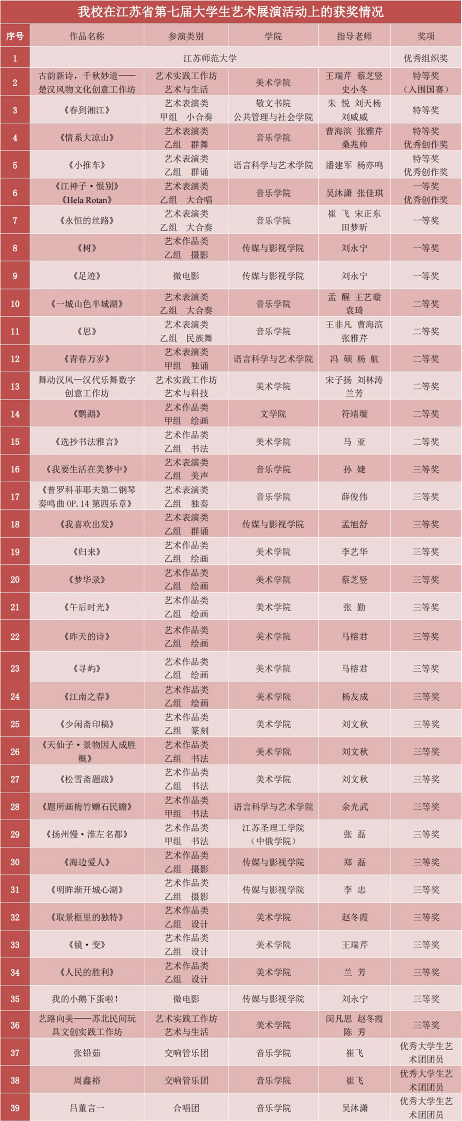 美术学院的“古韵新诗,千秋妙道——楚汉风物文化创意工作坊”荣获特等奖并入围国赛,该项目以楚汉风物的创新发展为主题方向,依托汉文化发源地徐州的风物特点,以在地性的视角对造物文化进行衍生与转化。音乐学院舞蹈团表演的原创舞蹈作品《情系大凉山》荣获特等奖及优秀创作奖,作品以(中国)官方网站大学生志愿者奔赴四川凉山彝族自治州布拖县普及普通话为主线,舞动民族团结进步主旋律,奏响铸牢中华民族共同体意识的时代强音。语言科学与艺术学院的原创朗诵作品《小推车》荣获特等奖及优秀创作奖,作品以淮海战役为背景,以小推车为线索,深刻诠释“人民”的战争伟力、军民团结的深深情谊。音乐学院教师作曲、合唱团演唱的《江神子·恨别》是苏轼离任徐州时的词作,荣获一等奖及优秀创作奖。此外,敬文书院、公共管理与社会学院学生共同表演的民乐小合奏《春到湘江》荣获特等奖;音乐学院交响管乐团表演的管乐合奏《永恒的丝路》荣获一等奖。