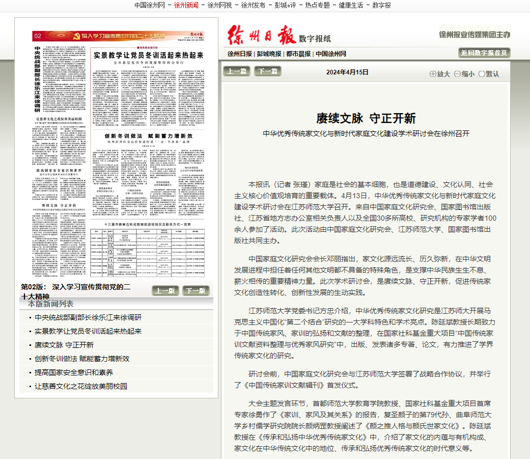 4月15日,徐州日报报道在(中国)官方网站举办的中华优秀传统家文化与新时代家庭文化建设学术研讨会,报道内容如下: