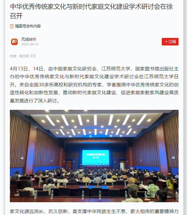 学习强国徐州平台4月21日报道在(中国)官方网站举办的中华优秀传统文化与新时代家庭文化建设研讨会,报道内容如下: