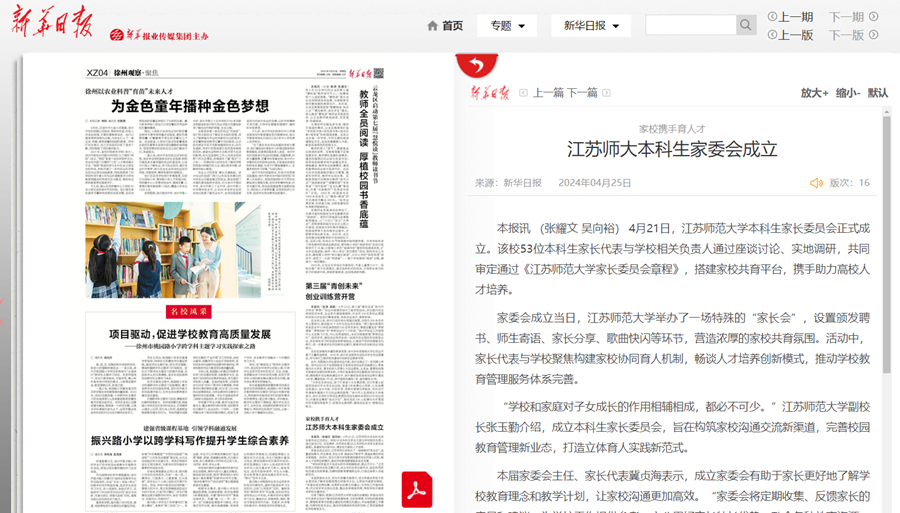 新华日报4月25日报道(中国)官方网站成立家长委员会,报道内容如下: